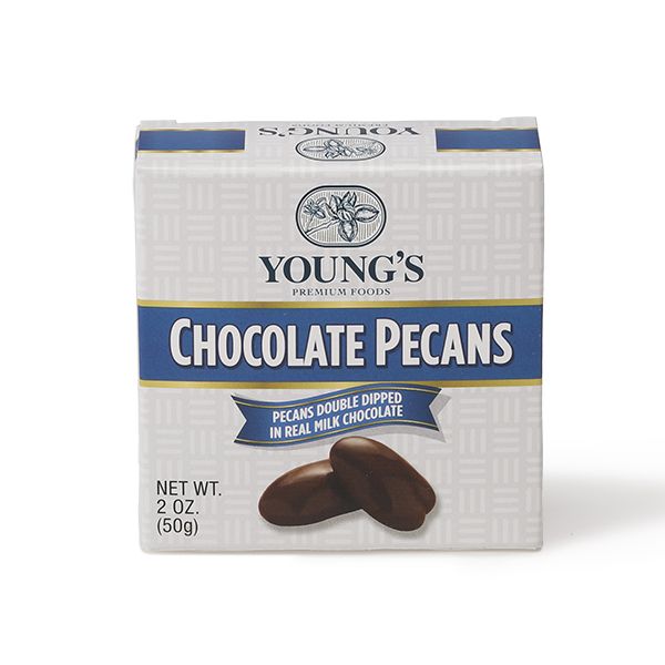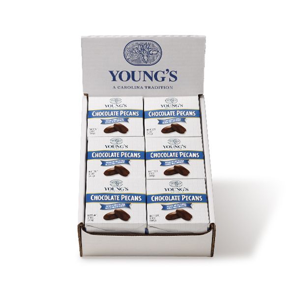 Crunchy pecans and rich, double-dipped chocolate come together for a classic favorite Individually packaged in convenient 2 oz boxes. Great for snacks, party favors, stocking stuffers, or gift baskets. Packaged in a white Young’s display box.