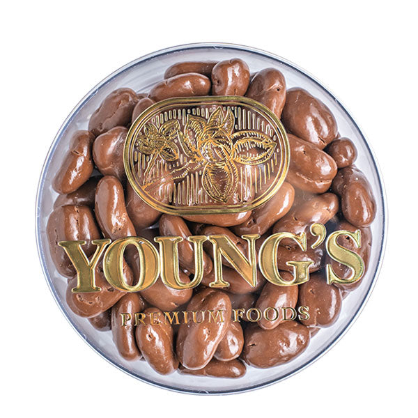Crunchy pecans and rich, double-dipped chocolate come together for a classic favorite. Presented in a clear acrylic container with the Young’s gold logo and packaged in a Kraft mailer, this offering is perfect for gifting or extended enjoyment and is sure to leave a lasting impression.